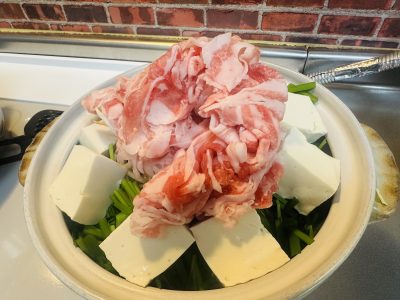 豚肉盛り込めきれず煮込んでから沈むのを待つ鍋。